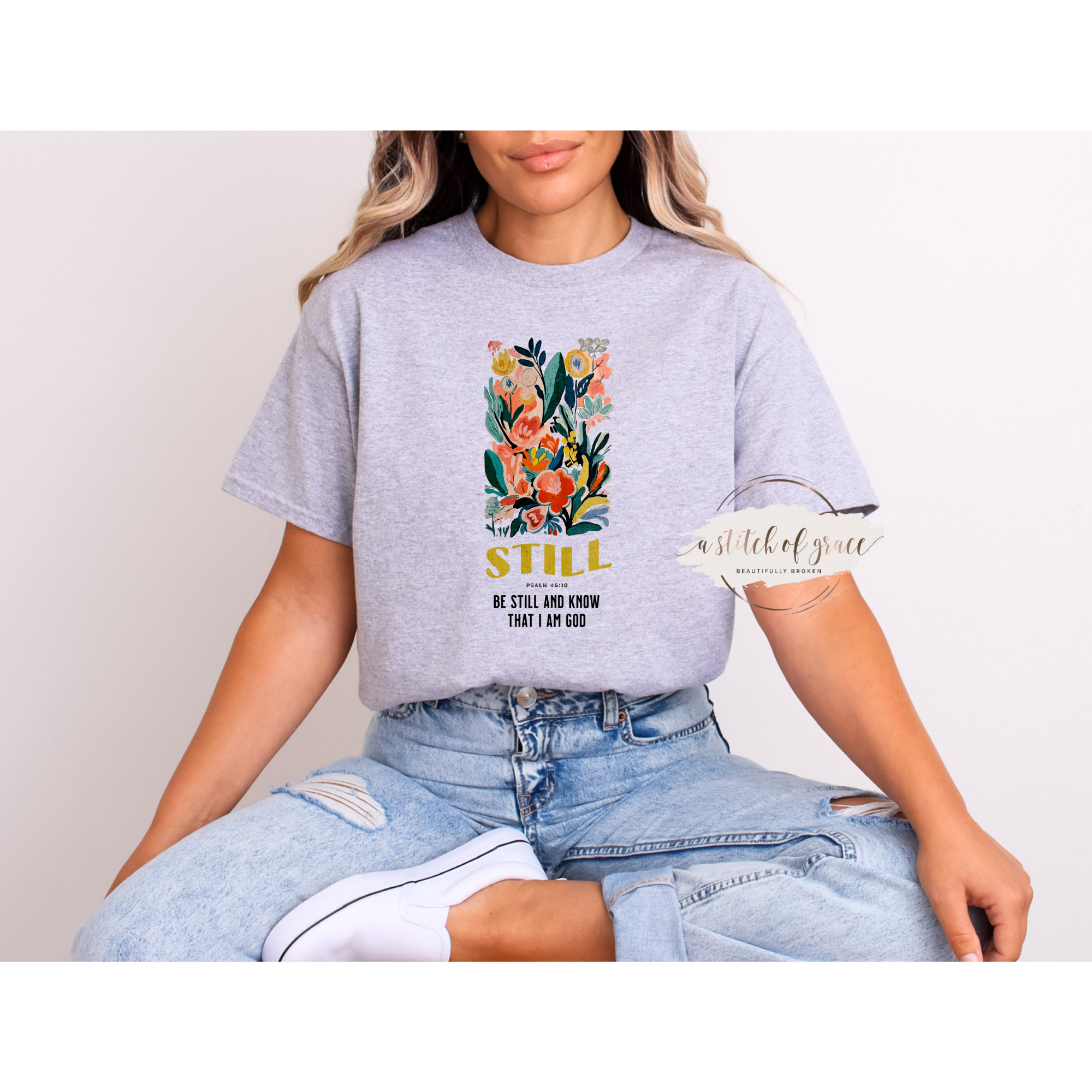 This faith-inspired design features soft, colorful florals paired with the powerful words “Be Still and Know That I Am God” from Psalm 46:10. Peaceful, uplifting, and timeless, it’s perfect for everyday wear, church, gifting, or moments when you need a gentle reminder to rest in faith. A meaningful piece that blends scripture with beautiful artistry.