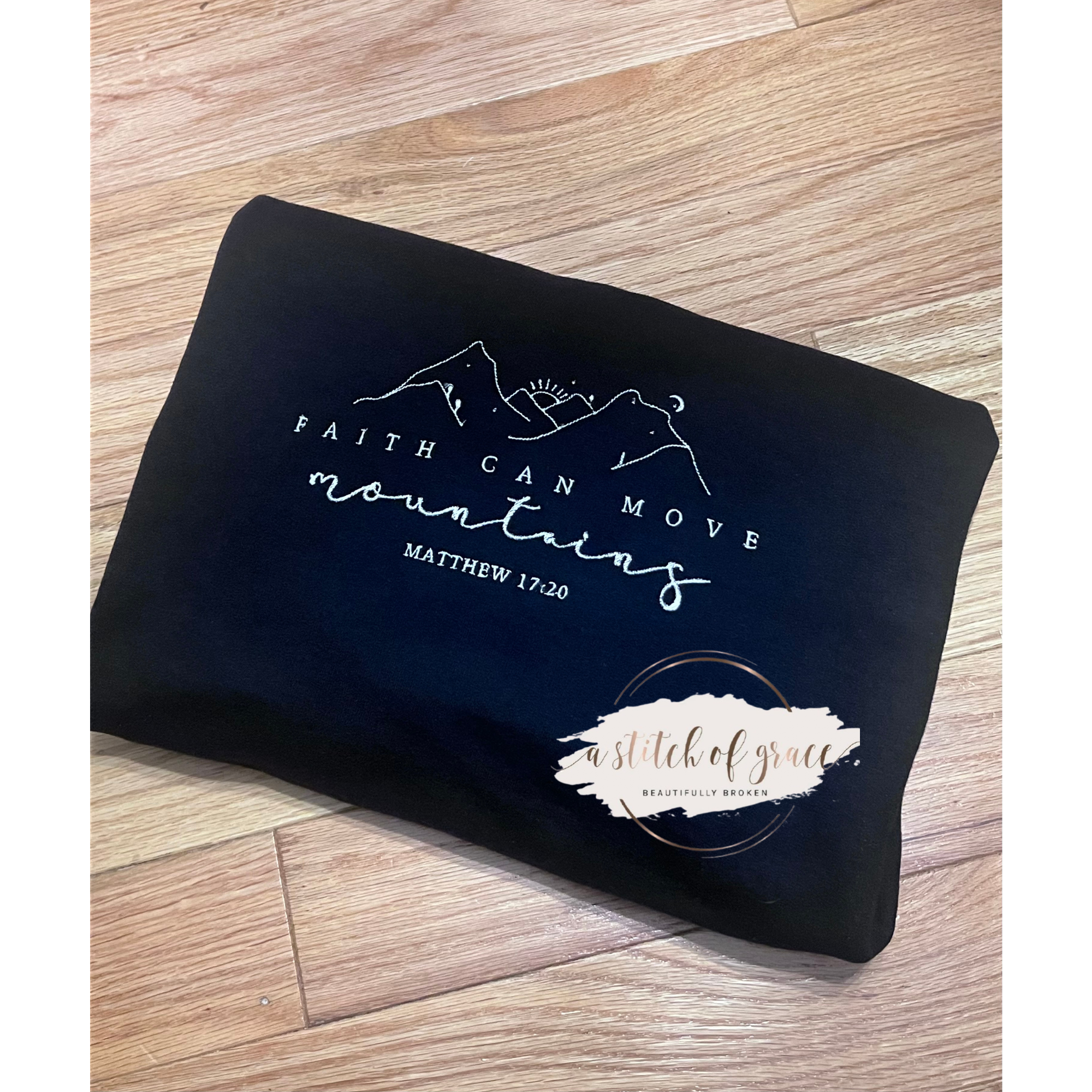A soft, cozy sweatshirt featuring timeless mountain embroidery and the inspiring words “Faith Can Move Mountains” from Matthew 17:20. Designed for everyday comfort with meaningful detail, this faith-filled piece is perfect for casual wear or gifting.