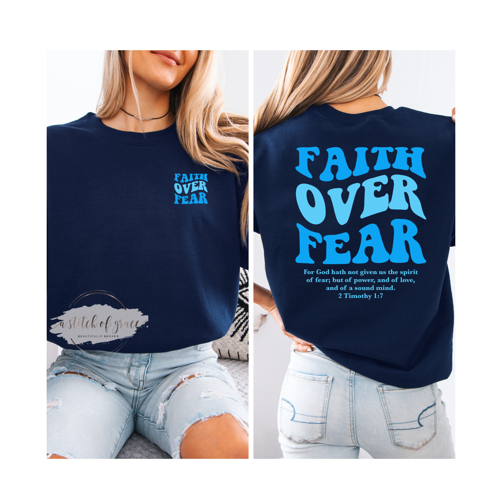 “Faith Over Fear.” Inspired by 2 Timothy 1:7, this long sleeve tee is a bold reminder to walk in power, love, and a sound mind.